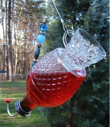 Large capacity yet graceful hummingbird feeder with decorative teacup