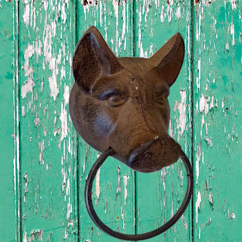 Cast iron Pig Face Towel Ring comes straight from the farm, brings a country flavor (no, not bacon) to bath, bar or kitchen. Sans towel or with, unassuming pig makes for unique wall decor. Notched back for easy hanging.